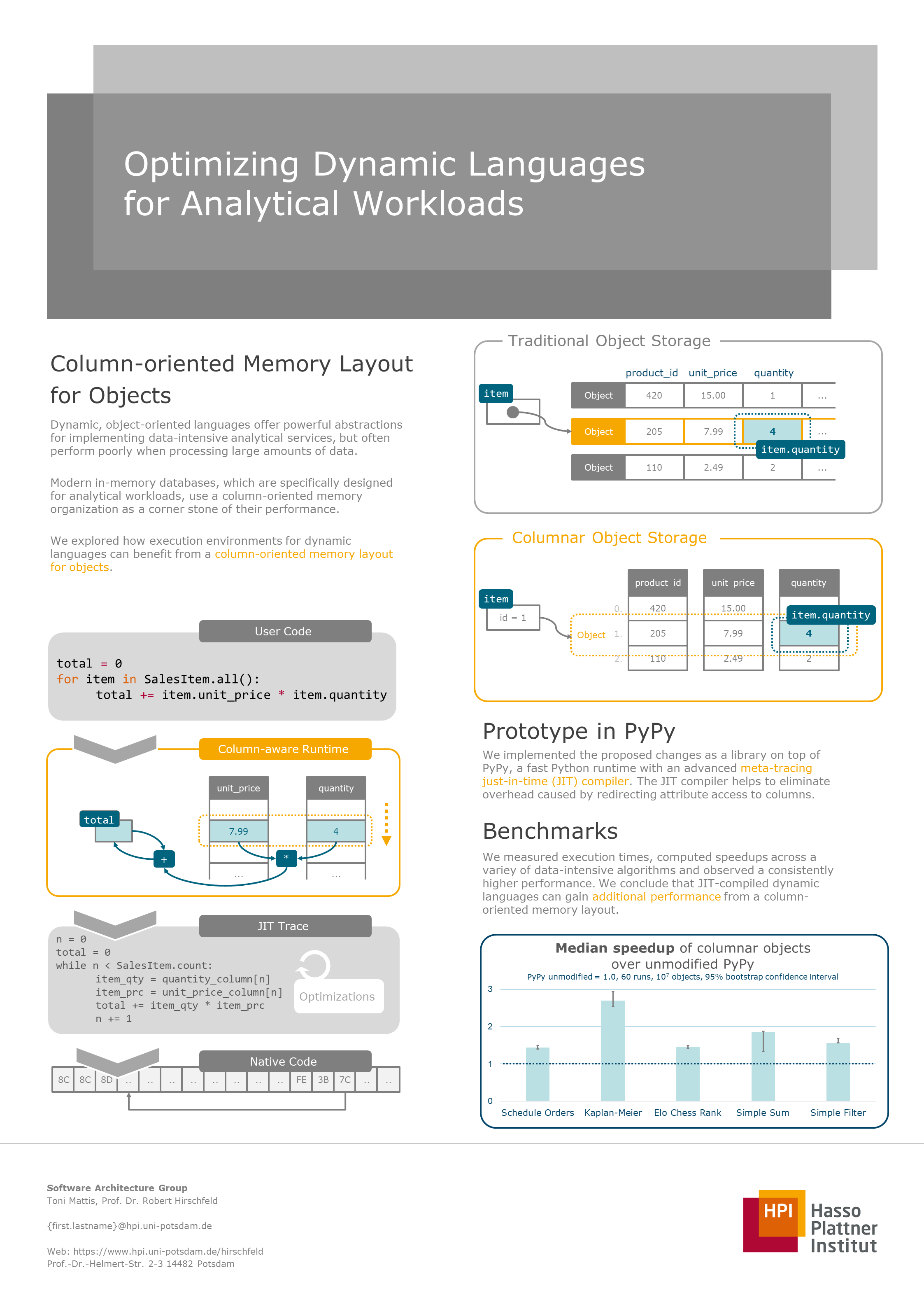 Paper (ACM), Preprint (PDF) - T. Mattis, J. Henning, P. Rein, R. Hirschfeld, and M. Appeltauer, Columnar Objects: Improving the Performance of Analytical Applications, in 2015 ACM International Symposium on New Ideas, New Paradigms, and Reflections on Programming and Software (Onward!), Pittsburgh, PA, USA, 2015.