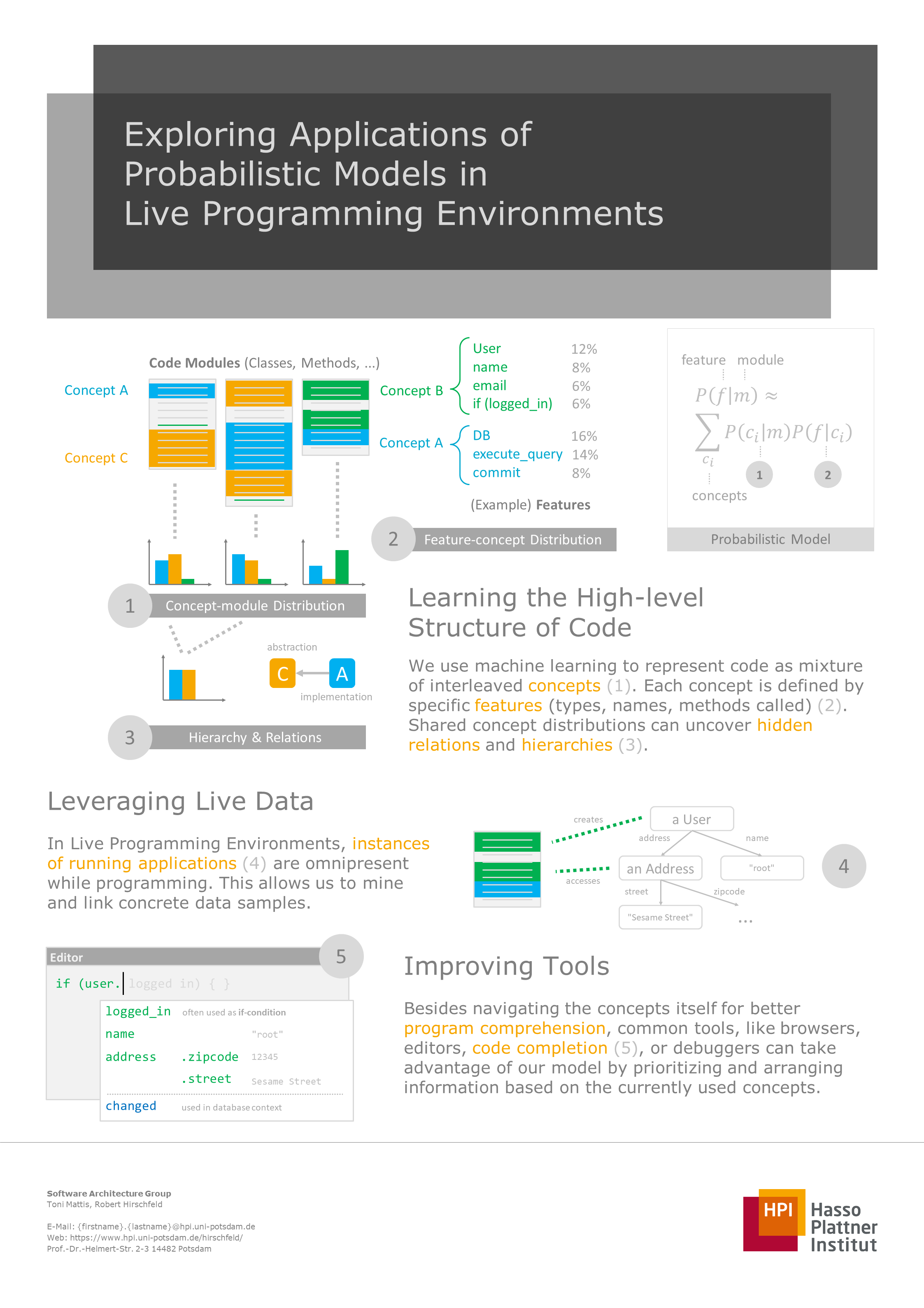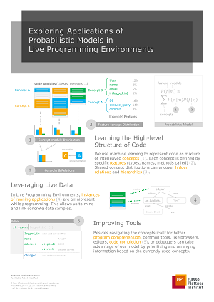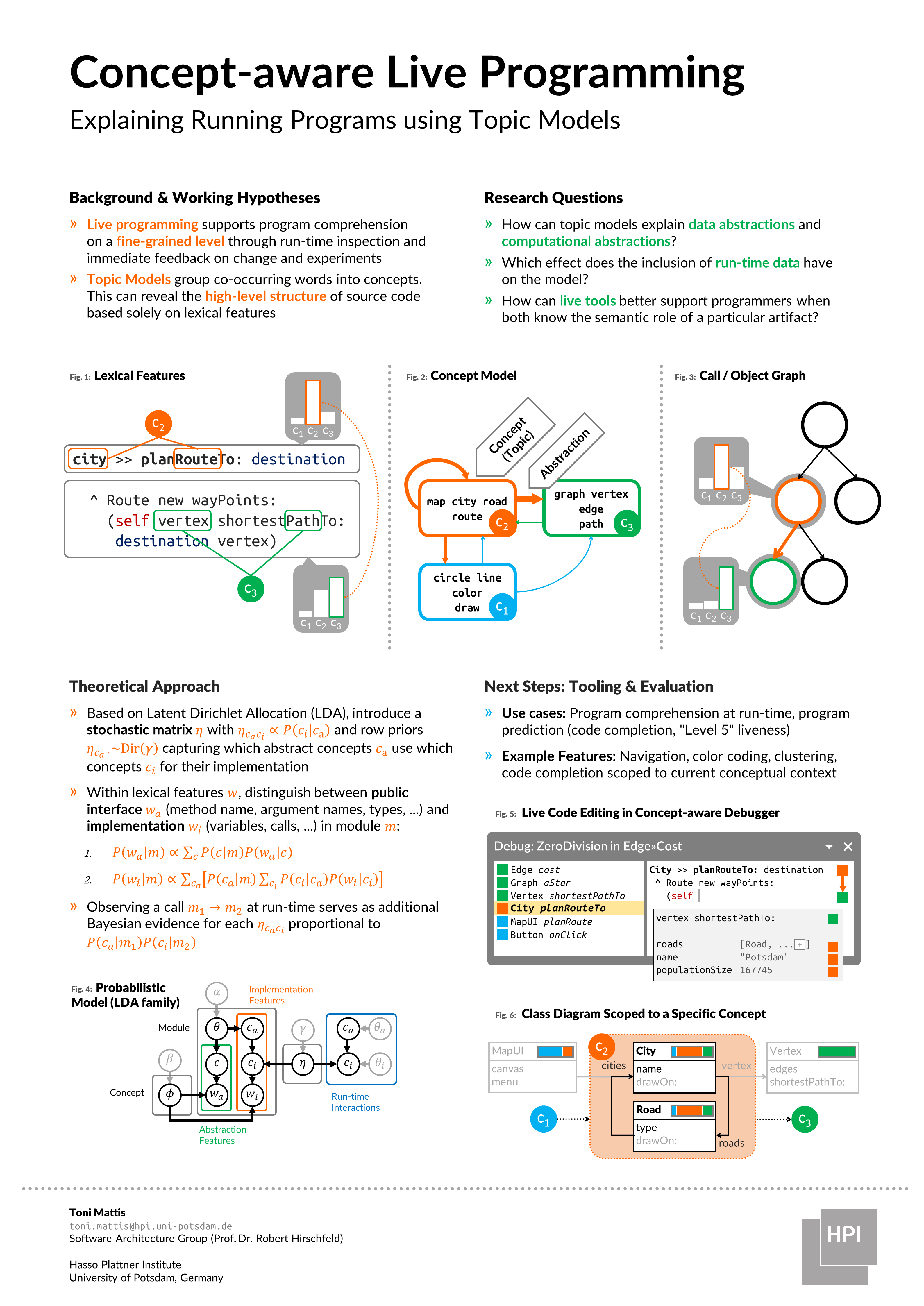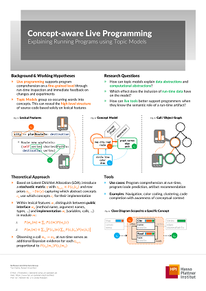Paper (Open Access), Talk, Slides (PDF) - T. Mattis, Concept-aware Live Programming: Integrating Topic Models for Program Comprehension into Live Programming Environments, in Companion to the First International Conference on the Art, Science and Engineering of Programming, Brussels, Belgium, 2017, p. 36.