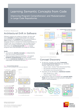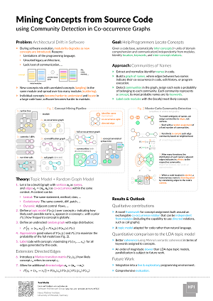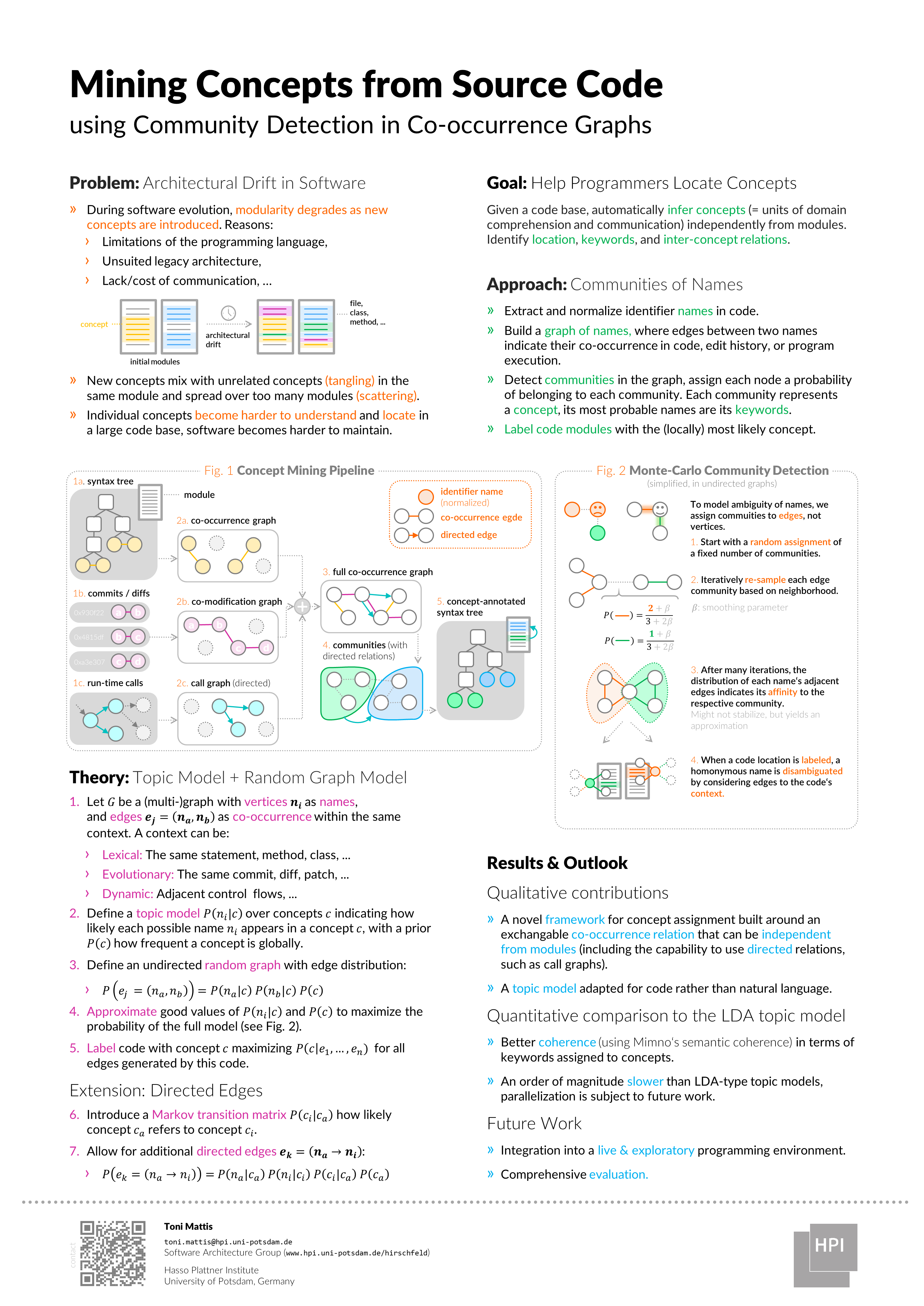 Paper (ACM), Preprint (PDF), Slides (PDF) - T. Mattis, Mining Concepts from Code using Community Detection in Co-occurrence Graphs, Conference Companion of the 2nd International Conference on Art, Science, and Engineering of Programming, Nice, France, Apr. 2018.