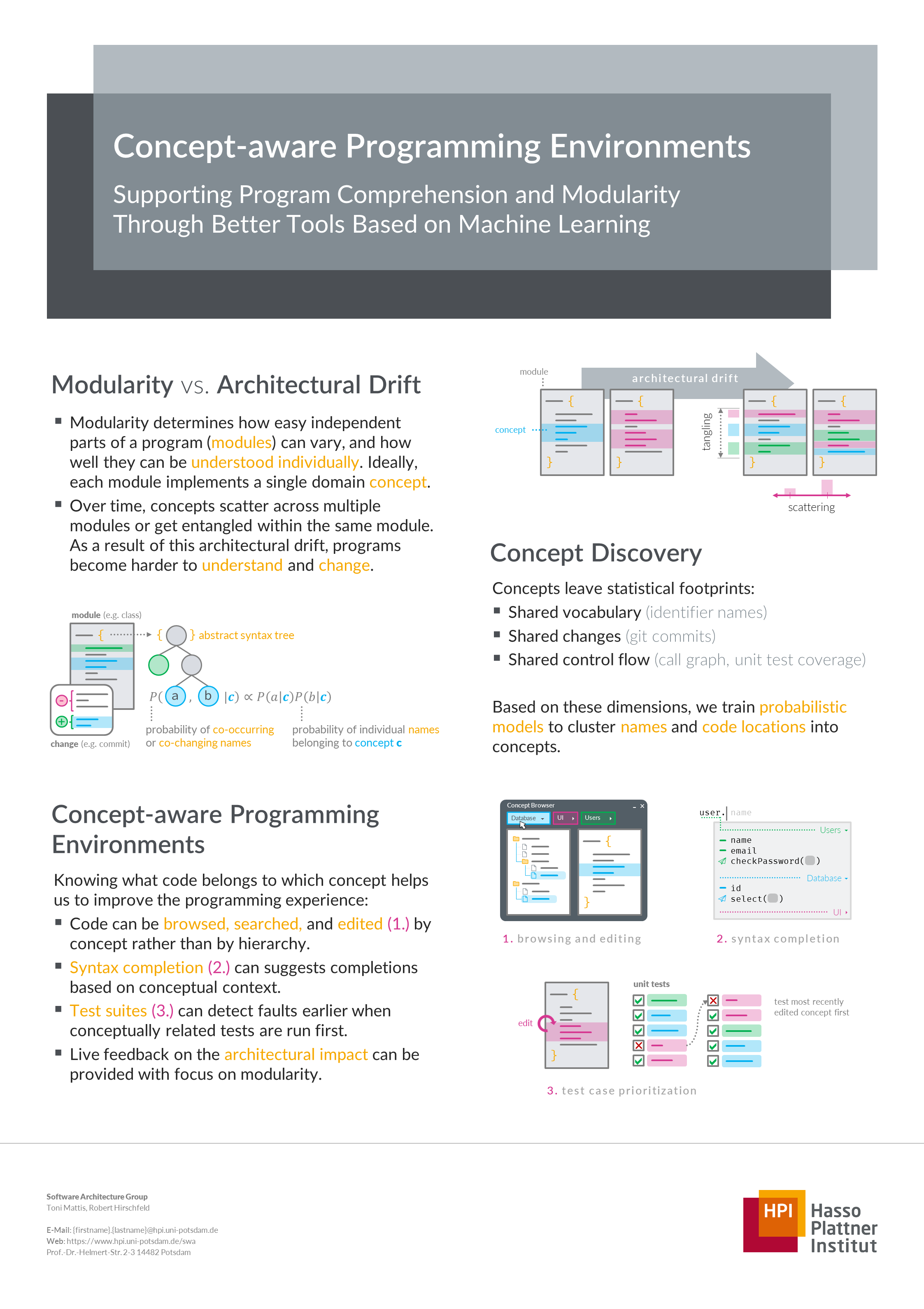 - T. Mattis, P. Rein, S. Ramson, J. Lincke, and R. Hirschfeld, Towards Concept-aware Programming Environments for Guiding Software Modularity, Proceedings of the 3rd ACM SIGPLAN International Workshop on Programming Experience, Vancouver, BC, Canada, Oct. 2017.