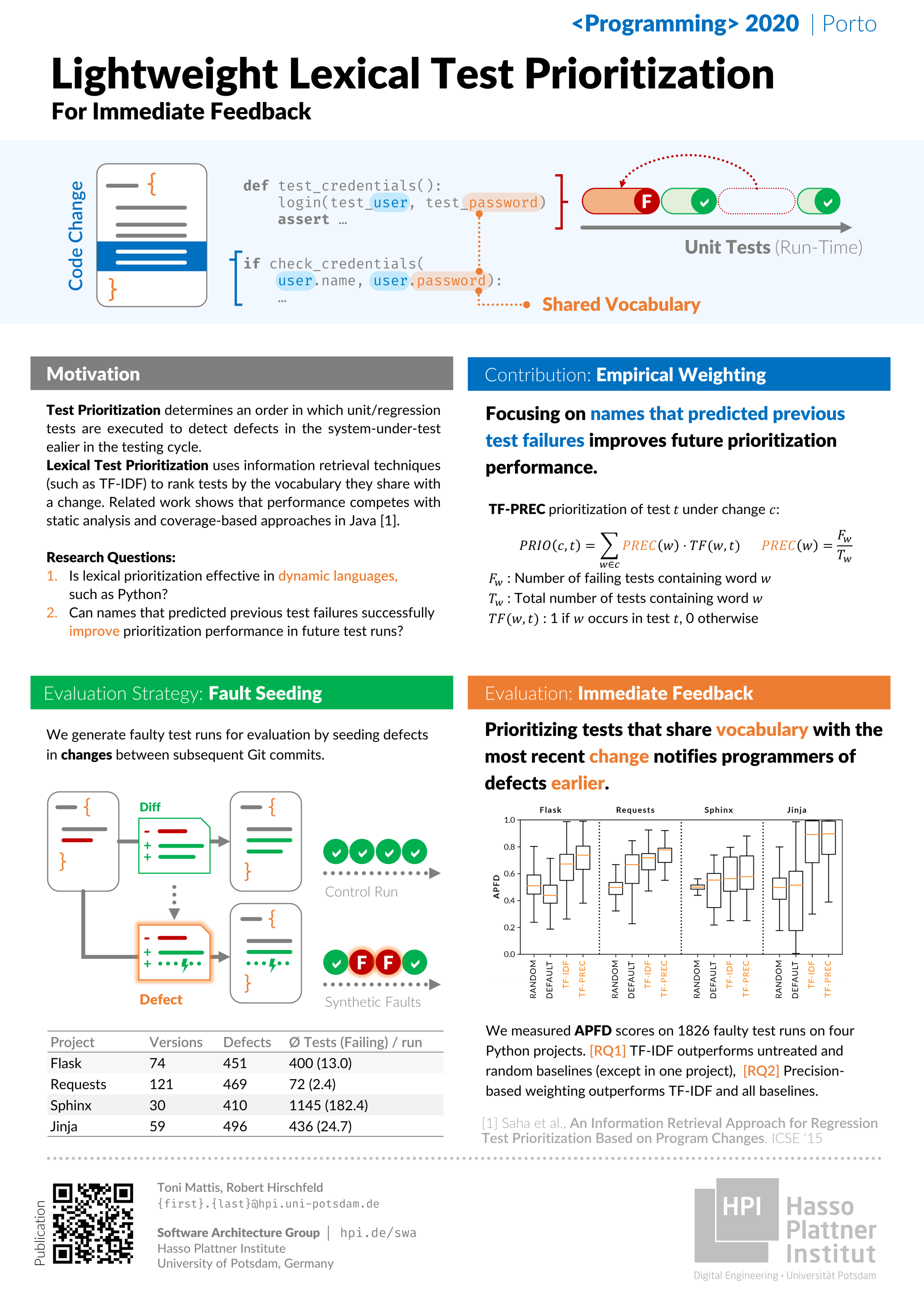 Paper (ACM), Preprint (PDF) - T. Mattis and R. Hirschfeld, Lightweight Lexical Test Prioritization for Immediate Feedback, The Art, Science, and Engineering of Programming, Vol. 4, Nr. 3.